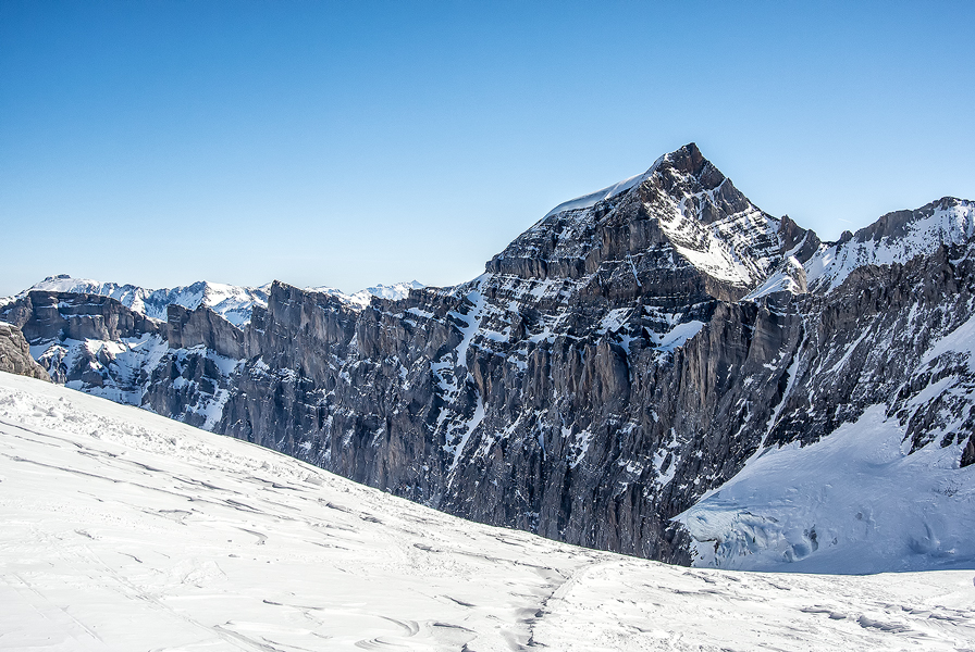 Samstag Morgen klingelte der Wecker schon um 04:20 Uhr. Nach dem Frühstück ging es ca. 05:30 Uhr los. Von der Hütte querten wir zuerst ein kleines Stück Richtung Bifertenfirn und stiegen auf den Gletscher ab. Links ausholend durch den 1. Gletscherbruch und von den Felsen unterhalb des Bündner Tödis stiegen wir auf bis zur Schneerus. Hier schnallten wir die Ski auf den Rucksack und stiegen mit Steigeisen die Schneerus hinauf (2807 m). Von hier aus ging es problemlos weiter bis auf den Gipfel, auch wenn sich der Weg doch noch sehr hinzog. Das Panorama vom Tödi ist einfach überwältigend! Nach kurzer Gipfelrast fuhren wir auf derselben Route wieder hinunter. Im Schneerus schnallten wir abermals die Ski auf den Rücken und stiegen mit Steigeisen ab. Knapp 3000 Hm später kamen wir ziemlich erschöpft, aber glücklich wieder in Tierfehd an. Eine Traumtour!